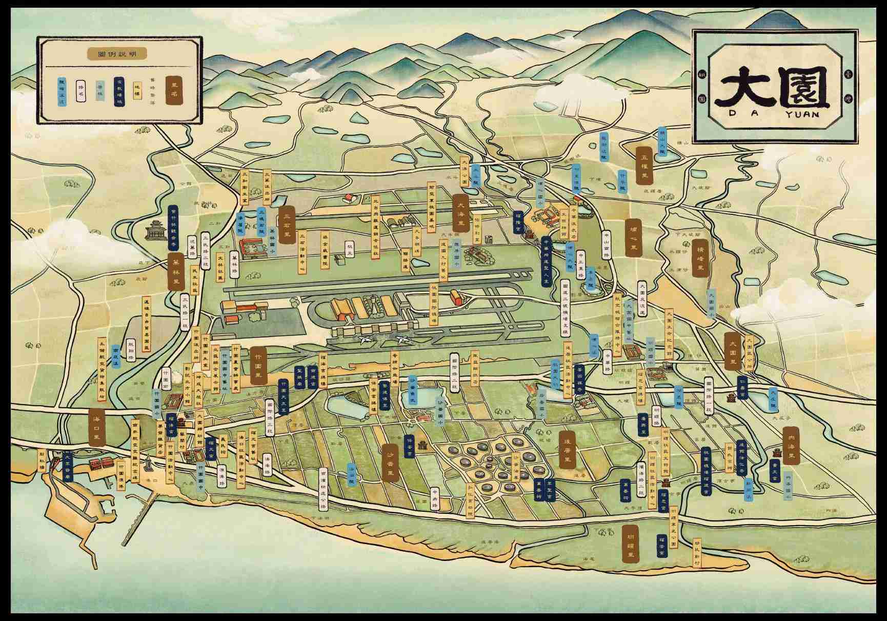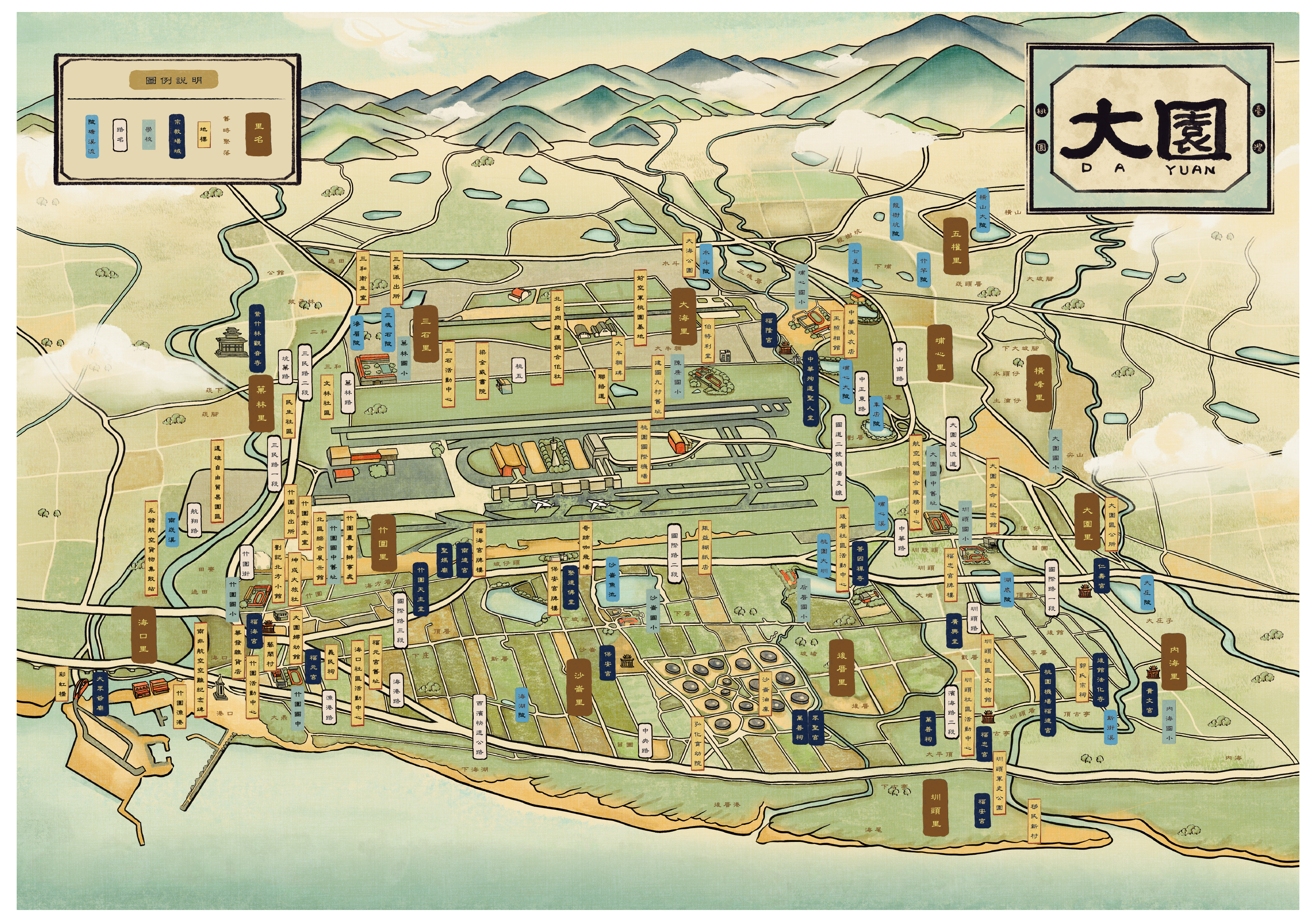• 內容匯集為「今昔變化的在地空間」、「多元發展的在地宗教」、「百工百態的在地產業」、「環境影響的在地教育」、「聚落人物的在地記憶」五大主題,從大園在地特有的地景到人物的日常點滴,發掘空間地景裡的意義,梳理區段徵收範圍內,地方的文史脈絡與區域特色。
