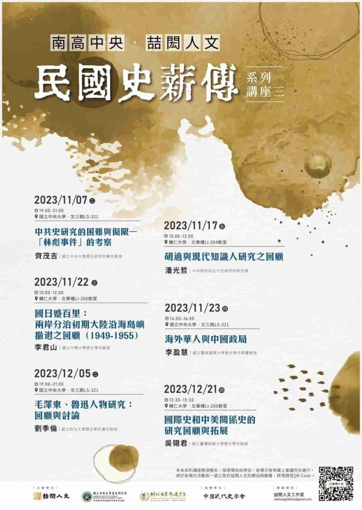 前輩學者們的引路經驗與傳承回顧,絕對是維持學術研究能量不墜的不二法門。為此,本工作室特與國立中央大學歷史研究所、輔仁大學歷史學系、中國近代史學會等學術單位共同合作,邀集國內民國史各領域研究專精的資深學者,在前兩期的基礎之下,繼續推出「南高中央‧喆閎人文」民國史薪傳系列講座第三期,藉此激盪民國學風,傳承大師風範。