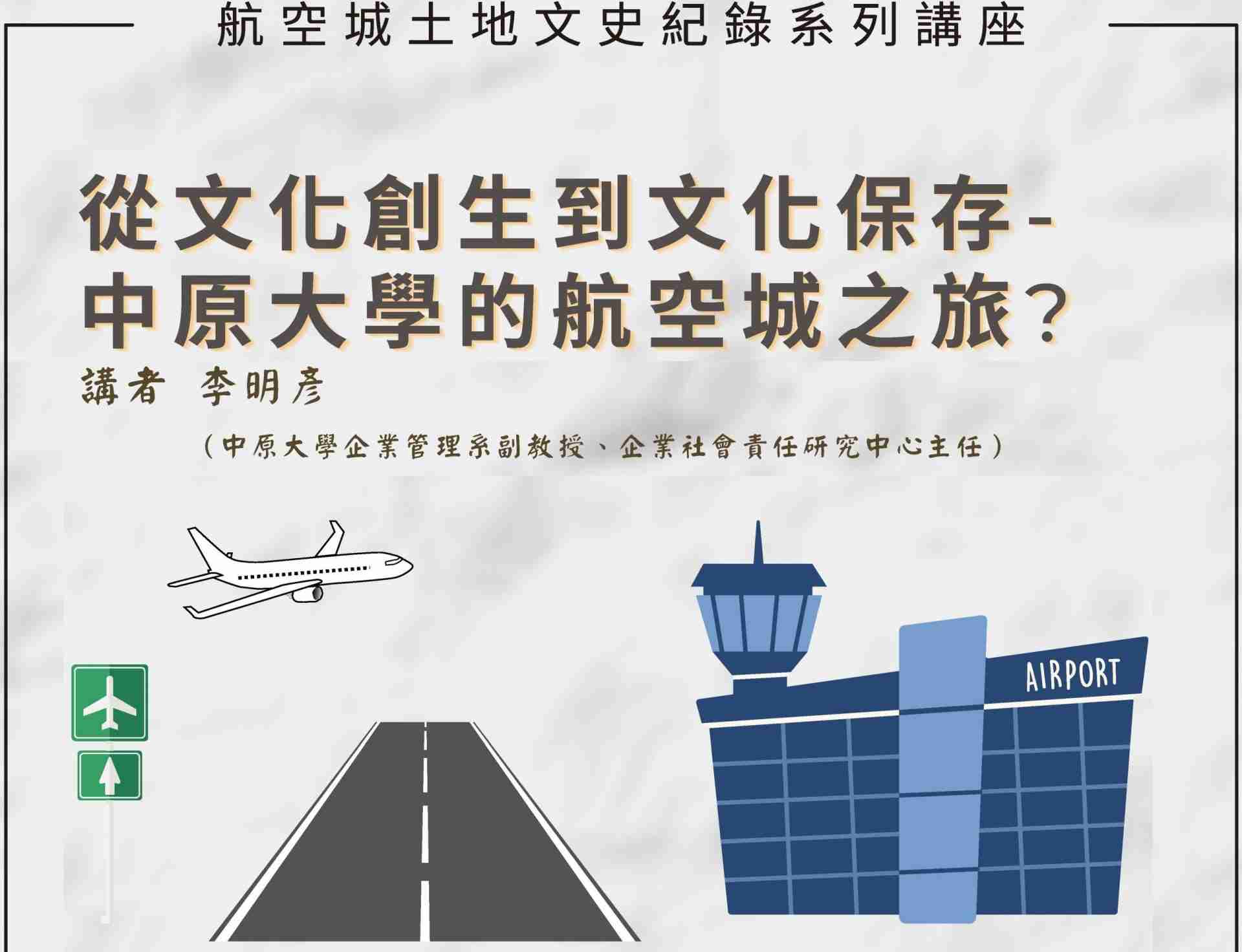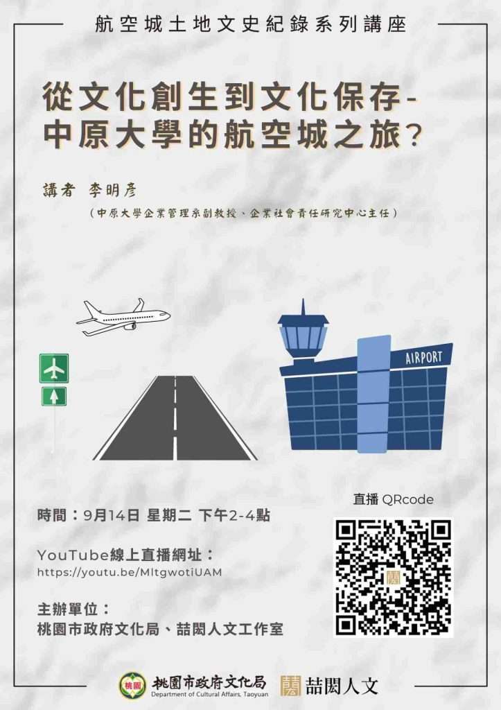 首頁 史學玩應用演講快訊:從文化創生到文化保存-中原大學的航空城之旅?史學玩應用活動快訊演講快訊:從文化創生到文化保存-中原大學的航空城之旅? by 冷峰 09/08/2021 09/08/2021 657 瀏覽 657 活動連結 講者:李明彥(中原大學企業管理系副教授、企業社會責任研究中心主任)講題:從文化創生到文化保存-中原大學的航空城之旅?時間:民國110年9月14日(星期二)下午2-4點會議方式:YouTube線上直播(https://youtu.be/MltgwotiUAM)主辦單位:桃園市政府文化局、喆閎人文工作室 喆閎人文工作室文化保存文化創生到文化保存文化局李明彥桃園市政府文化局航空城 分享 0 FacebookLINEEmail 冷峰 上一篇 推薦好書:《跟史家一起創作:近代史學的閱讀方法與寫作技藝》 下一篇 演講快訊:桃園航空城遷徙區的訪談故事與杵尾仔古井 You may also like 推薦新書:《桃園市大園區志》 推薦新書:《圍龜放蛇話舊城》 推薦新書:《抗戰史研究的側面》 「從蘆溝橋到中山堂:抗戰勝利暨臺灣光... 「國軍英雄:抗戰與冷戰下的中華民國空...離開留言 取消回覆